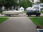 So I towed my boat last weekend with my XJ and my new rear discs. It towed pretty good. It was a little nervy on the way to the cabin because I have to cut across the reservation and it has alot of off camber turns and I have no sway bars....LOL. Anyways I got an 8 inch drop hitch and besides getting 13 MPG I have no real complaints. My trans is only cooled by a huge air cooled unit ( I divorced my factory POS cooler) and I was plesantly surprised to feel the fluid felt like bath water everytime I stopped and checked it. Here is a pic. BTW the boat is a 19 ft Sea Ray and it weighs 3500 lbs.  As you can see the rubi leafs squatted very little if any with 300 lbs tongue weight.